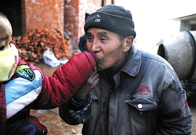 李艳菊带着儿子去工地看爷爷,老人已经年过花甲,为了老伴和孙子,他在附近村庄的建筑工地上打些零工,每天能挣到100块。