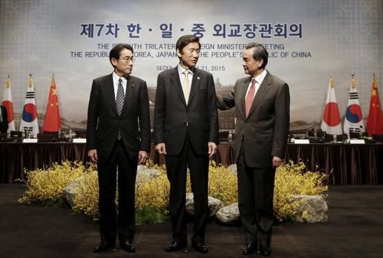 中国外交部长王毅(右)、韩国外交部长官尹炳世(中)、日本外务相岸田文雄留影。