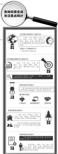 京华时报记者注意到,29个省区市中,北京、广东、四川、广西、内蒙古、辽宁、青海、新疆、天津、山西、陕西、海南这12个加上“基层”二字,占全国近4成,一些省份明确今年要对“乡镇”“农村”“街道”等基层腐败党员干部进行严查。