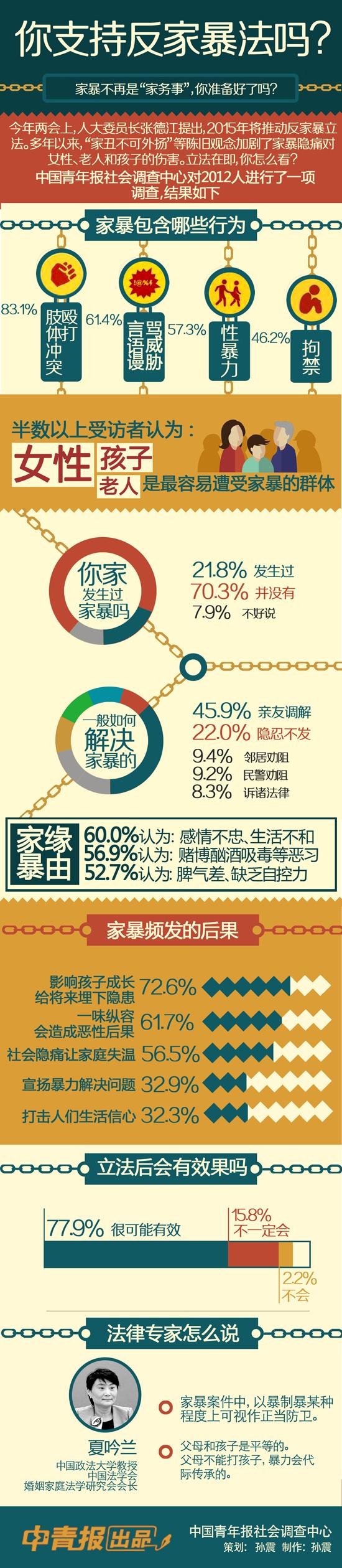 专家指出,家庭暴力得不到及时有效的制止和处理,很容易导致婚姻的破裂和家庭的离散,同时使加害人有恃无恐。而且,处在家庭暴力中的孩子通过耳濡目染、潜移默化,大大增加了他们长大后使用暴力的可能。