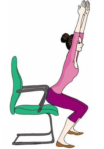 2. 椅式深蹲。坐在椅子边上,双臂可放于身前或伸过头顶;然后起身站直,缓慢吸气的同时,身体下沉,轻柔地坐回椅子边缘,重复10次?;箍梢栽黾幽讯龋呵?,将臀部悬在椅子上空30秒,这时你会感觉到臀部和大腿的热量在燃烧。预计燃烧热量:20卡路里。