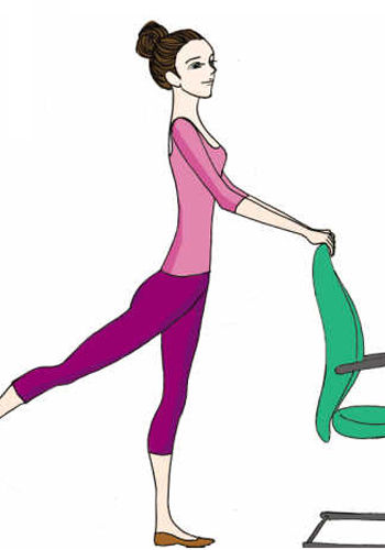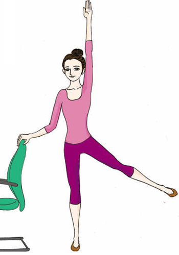4. 交叉摸腿。站立,手抓住椅背;右腿站稳,左臂举向天花板;然后左腿向身体左侧抬起,同时放下左臂去抓右腿,重复20次,两侧交替进行。预计燃烧热量:30卡路里。