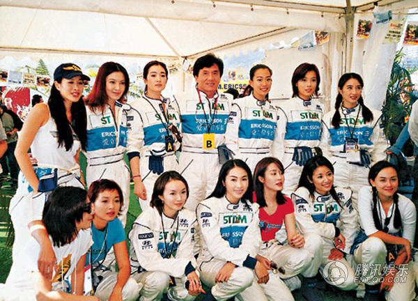 1999年的成龙杯慈善赛车会,前排:李绮红(左二)、黎姿(左四)、林心如(右二)、韩君婷(右一);后排左起:钟丽缇、林熙蕾、巩俐、成龙、吴辰君、容祖儿、关咏荷。 (来自:腾讯娱乐)