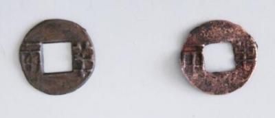 出土的剪轮“半两”铜钱及铁刀。