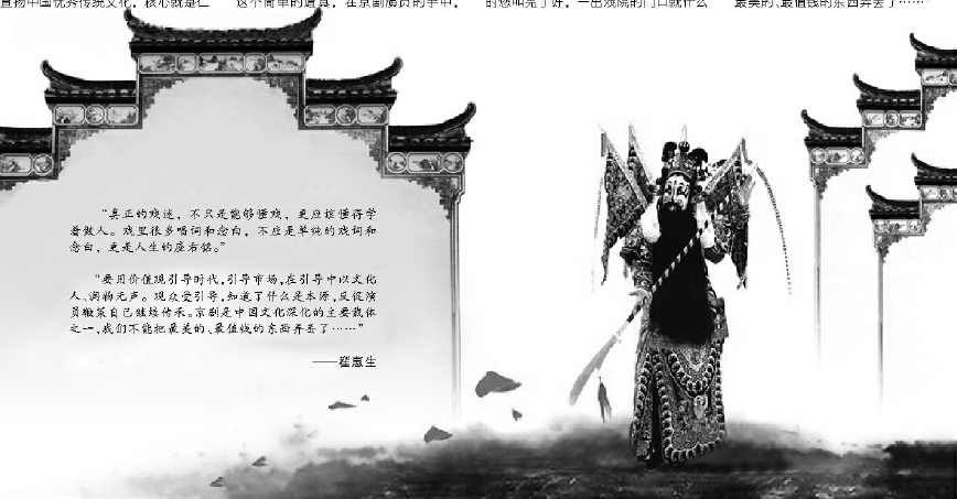 “要用价值观引导时代,引导市场,在引导中以文化人、润物无声。观众受引导,知道了什么是本源,反促演员鞭策自己继续传承。京剧是中国文化深化的主要载体之一,我们不能把最美的、最值钱的东西弄丢了……”