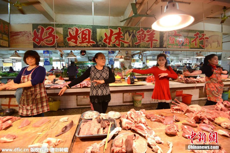 2015年3月27日,广西南宁市,官塘菜市的摊主们在摊位前跳起健身舞。据了解,南宁市民主路官塘菜市的女摊主们在菜市场跳起“疯狂”舞姿,给人们都留下了深刻印象。她们利用午后顾客少的闲暇时间,在菜市的过道空地上,跳起健身舞蹈来健身和娱乐,现在,每天下午两点钟到三点半钟,几乎全市场的中青年妇女都会在一起跳舞。跳健身舞成为女摊主们的日常练摊生活内容之一。不仅锻炼了身体,还拉近了彼此的关系。图片来源:东方ic 版权作品 请勿转载