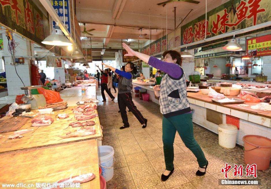 2015年3月27日,广西南宁市,官塘菜市的摊主们在摊位前跳起健身舞。图片来源:东方ic 版权作品 请勿转载