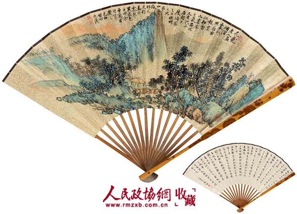当然,成扇的收藏,还是以扇面上的绘画和书法最为重要。一书一画,体现文人的情怀和交游的酬唱。启功、寿石工《青绿山水、小楷七言诗》成扇,一面是启功拟卞文瑜山水,启功对卞氏山水颇为欣赏,在题识中写下了这样的评语:“花龛老人画烟润处似思翁,古艳处似松雪,而书卷之气盎然,又在沈子居,赵文度诸家之上,晚明之大家也。”另一面是寿石工抄录的文廷式诗作,寿先生在题识中留下了“云起轩诗饶奇气”的评价。此件作品体现了老先生们赏画习文而有所得的真性情。