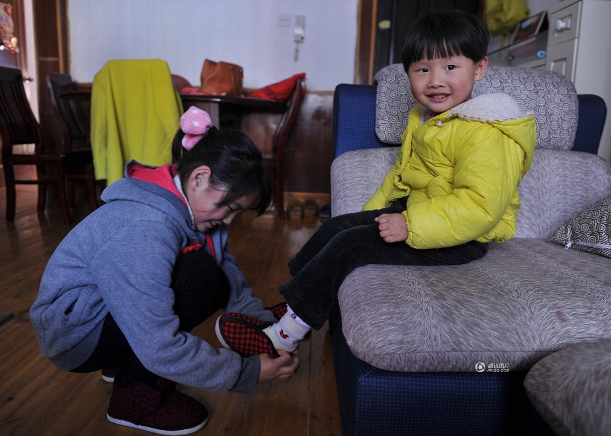 3月25日,江西九江, 上三年级的2姐,帮着爸爸妈妈照顾妹妹。