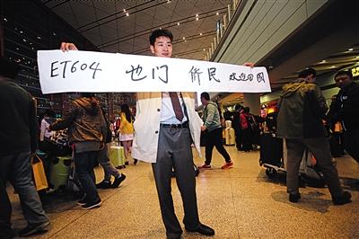 昨晚9时许,埃塞俄比亚航空工作人员打出欢迎条幅。