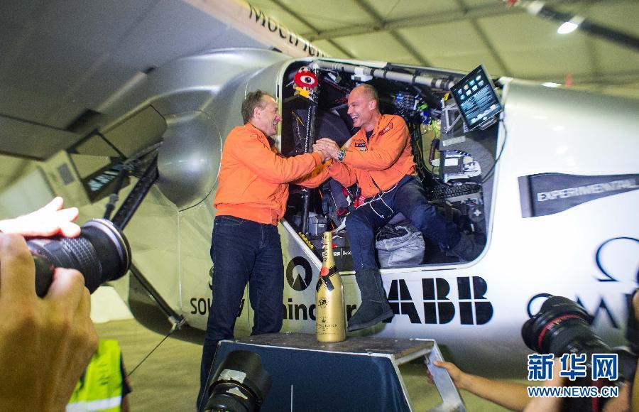 3月31日凌晨,“阳光动力”2号飞行员安德烈·博尔施伯格(左)与本段航程的飞行员贝特朗·皮卡尔(右)握手,向他平安顺利完成本段飞行计划表示祝贺。
