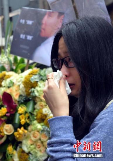 4月1日,张国荣离世十二周年,大批“哥哥”的歌迷在香港中环文华酒店外,摆放鲜花向偶像悼念追思。图为一名女“粉丝”向“哥哥”摆放鲜花后悼念留泪。中新社发 邓庆乐 摄