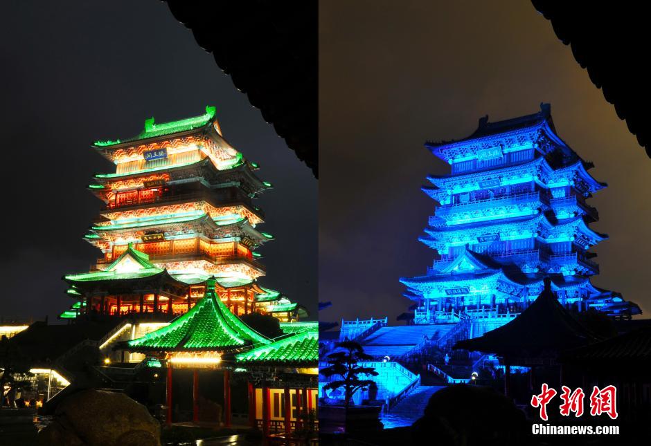 4月2日晚,位于江西南昌赣江之畔的江南名楼滕王阁点亮蓝灯,蓝色灯光齐齐映射在楼体上,显得神秘而高大。为响应世界自闭症日“蓝色行动”,当天晚上8点整,江南名楼滕王阁携手岳阳楼、黄鹤楼等中国十大名楼共同为自闭症儿童点亮蓝灯,呼吁更多的人群关注自闭症儿童。4月2日是第八个世界自闭症日,自闭症儿童被称为“星星的孩子”,他们就像天上的星星,在遥远而漆黑的夜空中独自闪烁。 中新社发 刘占昆 摄
