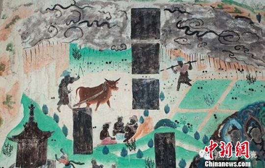 莫高窟第23窟北壁画面上乌云迷漫,细雨沥沥,一位农夫挥鞭策牛耕地,一位农夫肩挑庄稼。田头上坐着一家老少?;嬉彩欠鸾叹浠?,本来是为宣扬平等佛慧,犹如甘露时雨,普润万物。但同样在宗教因素之外,这也是一幅难得的古代“雨中春耕图”。
