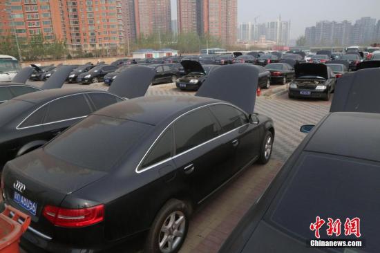 4月9日,第三轮中央和国家机关取消公车专场拍卖会在北京花乡旧机动车市场举行预展。据悉,第三轮中央公车拍卖将在4月开办5场,共计将拍卖近600辆公务车,其中包括奔驰、宝马、凯迪拉克等豪华品牌车型在内的部分外事车辆。4月11日,共有124辆公车参与拍卖。中新社发 刘宪国 摄 图片来源:CNSPHOTO
