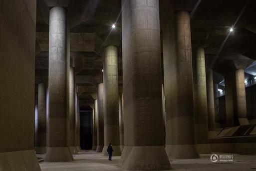 当地时间2015年4月8日,日本东京,世界上最大的地下排水系统——“首都圈外围排水系统”。它建造于1992年至2006年之间,共耗资30亿美元,堪称世界上最先进的下水道排水系统。全长6.4公里,排水系统包括5个高65米、宽32米的巨型竖井,竖井之间由内径约10米的管道连接起来。前4个竖井里导入的洪水通过下水道流入最后一个竖井,集中到由59根高18米、重500吨的大柱子撑起的巨大蓄水池中。日本人将这个长177米、宽78米的蓄水池称作“地下神庙”。“地下神庙”曾经在多部电影和戏剧中出现过。