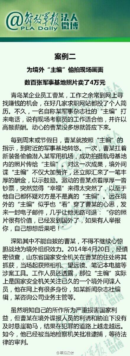 每到周末或节假日,曹某就按照“主编”的指示,到附近的军事基地转悠。一次,曹某扛着新装备偷偷潜入某军用机场,成功拍摄航母基地内的照片传给“主编”。对这一次成果,境外间谍“主编”不仅大加赞许,还立即汇来了一笔丰厚的酬金,以示鼓励。激动的曹某点着厚厚一沓钞票,突然觉得“幸福”来得太突然了,以至于他自己都怀疑对方是不是真的“主编”。远在境外的“主编”似乎也“看”穿了曹某的心思,发来一封电子邮件,几乎让他无路可退:“你的照片很有价值,已经发到国外了,如果有人举报你,自己想想后果吧!”
