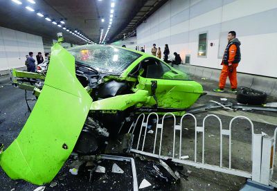 法制晚报讯 (夜线报道组 记者 谢璐 实习生 徐琨尧) 四百多万元的豪车撞墙尽毁,这样的场景估计只能在电影《速度与激情》中才能看到,但昨晚10时许,朝阳区大屯路隧道东向西方向,一辆兰博基尼与一辆法拉利在行车中发生事故,两车失控碾轧护栏,与隧道墙壁相撞。其中兰博基尼车辆报废,法拉利损毁严重。
