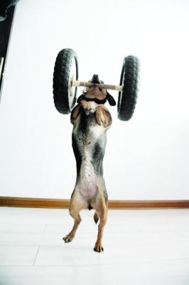 特点:不足6斤重的狗狗可以举起5斤重的杠铃;跳绳能跳四五十个;推篮球、小车,可以过障碍。