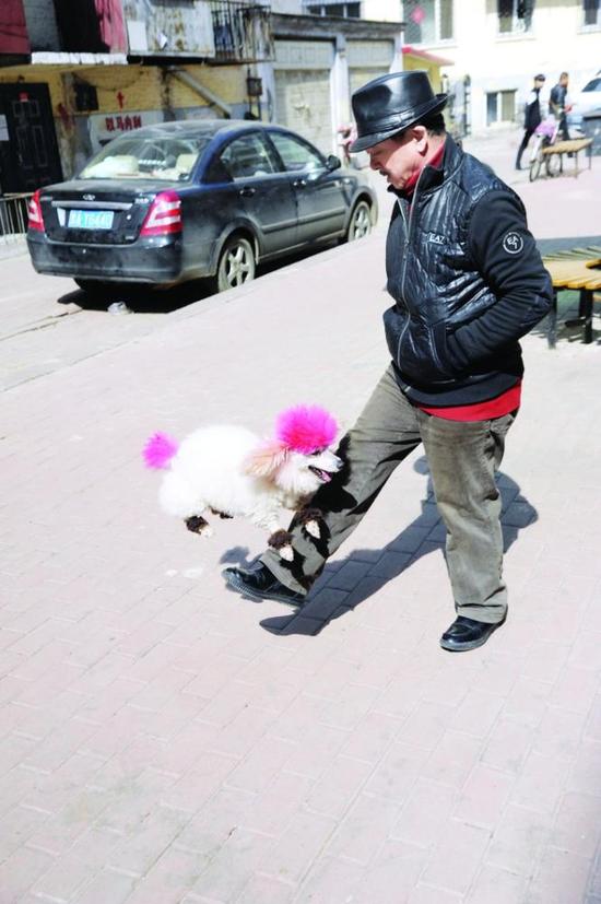 有着这身潮服装扮的是68岁的唐尚栋和他5岁的爱犬“明星”。“我从小就喜欢狗狗,以前也养过,但小明星最聪明,几乎是教它啥动作,它很快就能学会。自打养了这只小狗,我每天都领着小狗出去,而我们这身装扮也特别拉风,回头率近乎百分之百。”唐尚栋有些得意地说道。