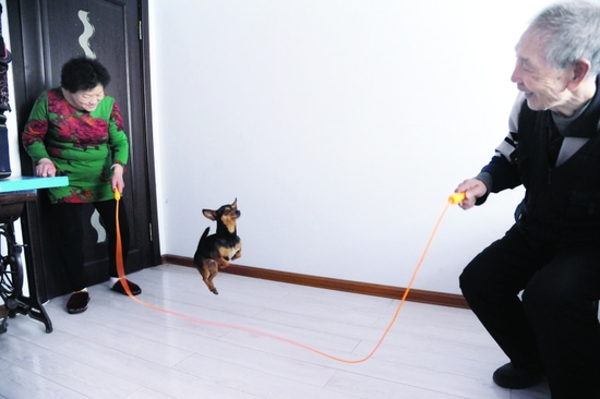 “预备,跳……”在主人的口令下,鹿鹿欢快地站在地板中间跳起绳,一共跳了32个,这让79岁的白志忠有些心疼:“它也老了,当年跳五六十个没问题。如果换算一下,俺的鹿鹿也有七八十岁了。”