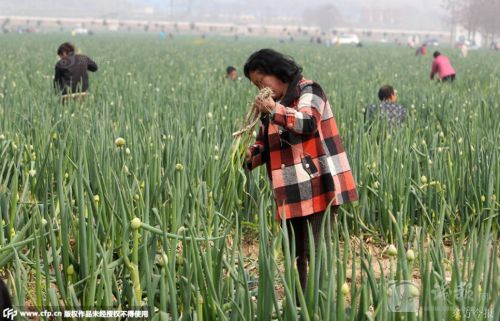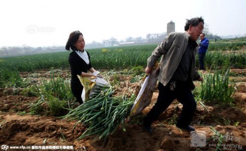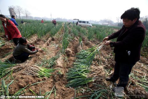 2015年4月9日,河南省郑州市,荥阳千亩大葱只卖出100亩,出现严重滞销,剩下900亩免费送。近日,虽然挖葱的人逐渐增多,但地里还有500余亩大葱没有采挖。