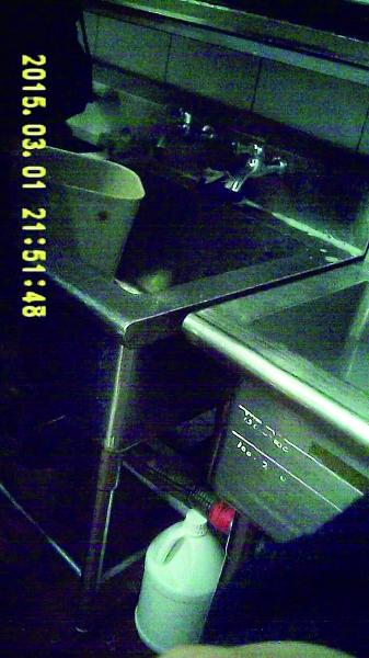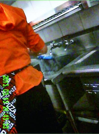 比格比萨紫竹店的后厨是里外套间,外间有5个并排的水池,其中左侧第二个水池的水龙头上标有“清洗池”,清洗池的功能主要是用来洗各种餐具。但记者在暗访期间发现,这个洗餐具的池子,换水频率并不高,洗餐具时用的都是死水。