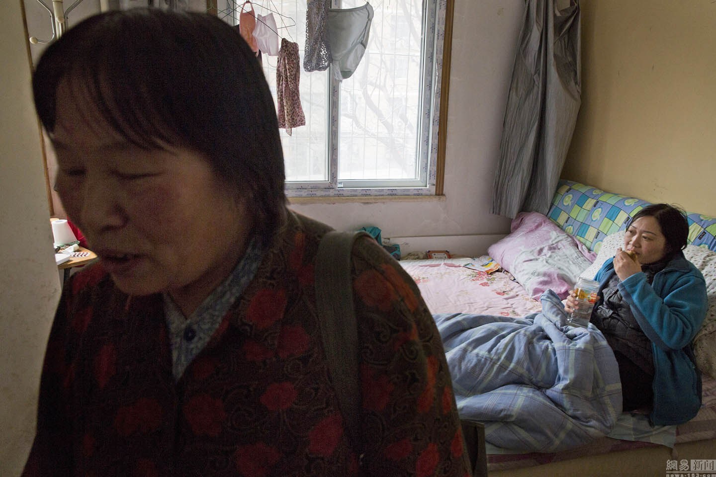3月16日,43岁的李晓禾(音)(右)来自河南,长途跋涉来到北京,她住的旅店价格便宜距离医院又近,这里聚集了许多全国各地待诊、接受治疗的癌症患者,这种旅店也被称作“癌症旅馆”。李晓禾现在租的蜗居虽小但阳光充足,而且距离中国最知名的肿瘤医院仅隔一个街区。她的丈夫正在公用厨房里做饭。她接受了切除部分右乳的手术,将在北京接受为期84天的化疗。