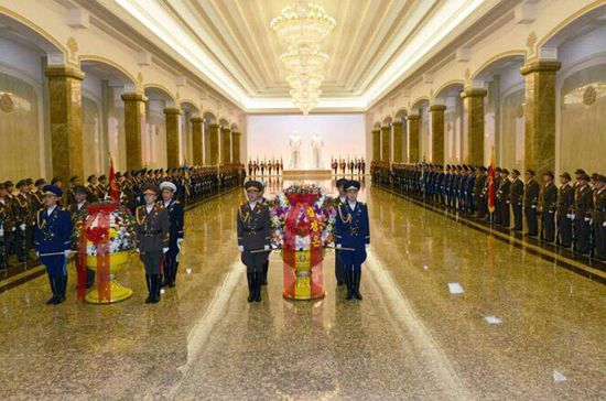 金正恩分别在金日成和金正日的遗体和雕像前瞻仰悼念,并代表朝鲜人民军向他们敬献花圈表示敬意。朝鲜陆海空军名誉卫兵队也列队在两位前最高领导人的雕像旁鞠躬行礼。