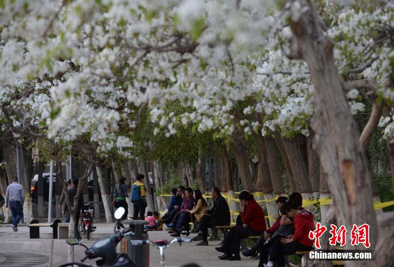 4月中旬以来,新疆南部春暖花开,梨花开放似江南,孔雀河畔拍摄的梨园。进入4月,被称为“梨城”的新疆库尔勒市桃花开,梨花笑,出现处处一派生机勃勃的景象。新疆库尔勒市市区的数千颗梨花开放时,既壮观又美丽,呈现出“半城水,半城梨花”景象。图为游客在库尔勒市市区梨园里拍照游玩。 确·胡热 摄