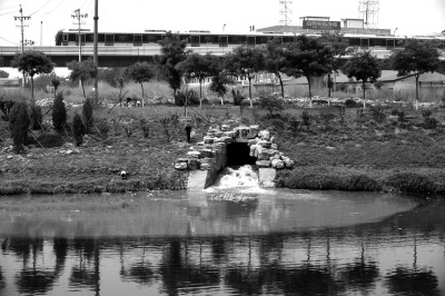 2012年6月1日,在北京旧宫地铁站东侧,一排污管向凉水河中排污水。(资料图片)京华时报记者朱嘉磊摄