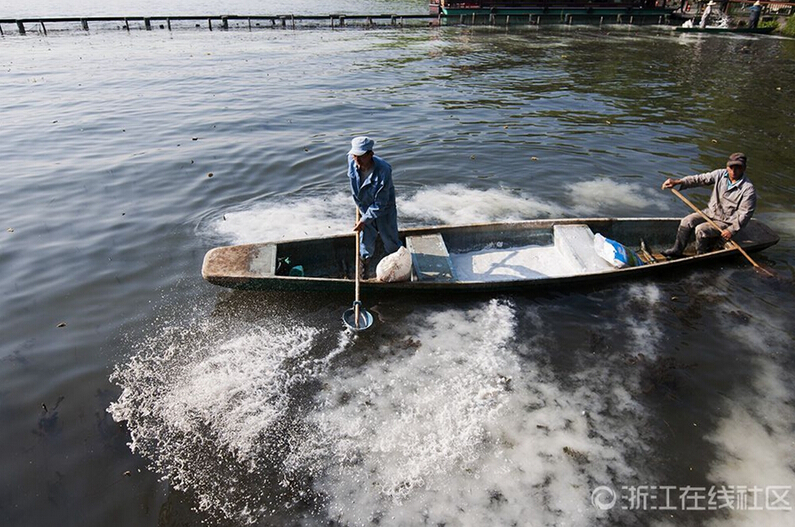 西湖景区开始清理荷塘。从天上俯瞰撒过漂白粉的荷塘,船儿犹如在云中穿行。