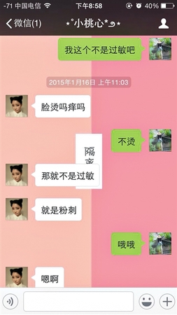 去年11月起,陆续有买家在网络上晒出面部发红、长痘甚至长毛的照片,称使用周梦晗卖的“三无面膜”后皮肤被毁,被医院诊断为过敏性皮炎和激素依赖性皮炎。