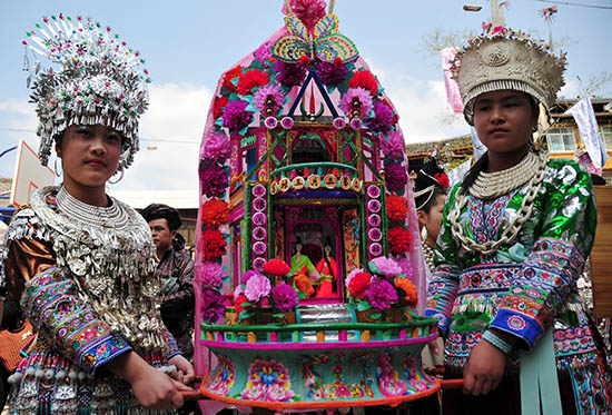 4月21日,广西壮族自治区三江侗族自治县福禄乡的两位女士抬花炮入场。