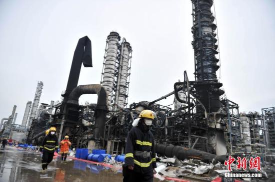 4月9日,福建漳州古雷石化着火罐体明火全部被扑灭,消防官兵正在做后续工作。中新社发 吕明 摄