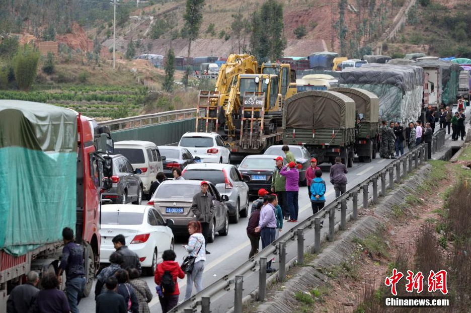 2015年4月22日8时许,云南省楚大高速路昆明往大理方向K82路段(下庄收费站不到3公里)处发生交通事故,由于清障施救,交警部门对该路段实行了临时交通管制。堵车后,附近的村民背起了食物走进高速公路叫卖,被堵路上了人们也纷纷下车解闷,其中不少大妈在车缝中跳起广场舞,更有大叔大妈直接对舞起来,场面犹如“斗舞”,十分火爆。图片来源:东方IC 版权作品 请勿转载