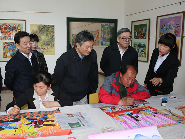 4月21日,民进中央常务副主席罗富和率民进中央调研组开始在陕西进行“构建现代公共文化服务体系 保障人民群众基本公共文化权益”大调研。图为调研组一行在西安市户县观看当地农民现场作画。