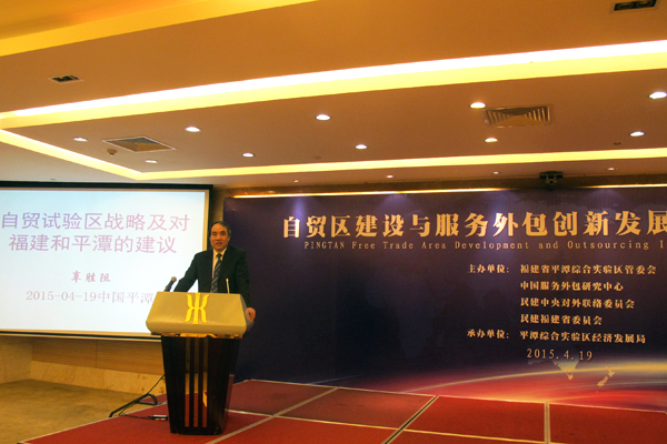 4月19日下午,由民建中央对外联络委员会参与主办的自贸区建设与服务外包创新发展研讨会在福建平潭召开。民建中央副主席辜胜阻出席会议,并发表题为《自贸试验区战略及对福建和平潭的建议》的主旨演讲。