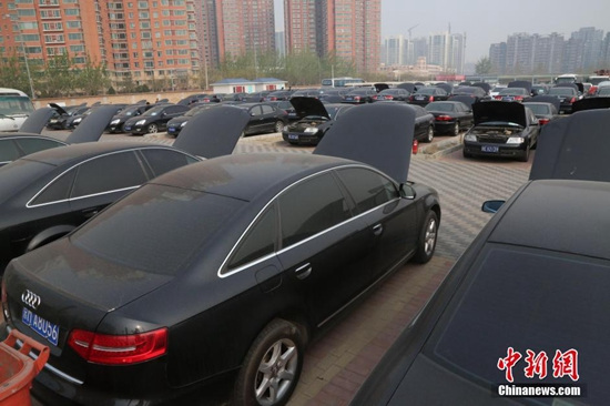 资料图:4月9日,第三轮中央和国家机关取消公车专场拍卖会在北京花乡旧机动车市场举行预展。据悉,第三轮中央公车拍卖将在4月开办5场,共计将拍卖近600辆公务车,其中包括奔驰、宝马、凯迪拉克等豪华品牌车型在内的部分外事车辆。4月11日,共有124辆公车参与拍卖。中新社发