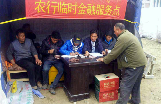4月27日,坚守灾区的农行西藏吉隆口岸支行员工在“帐篷银行”里为客户办理业务。