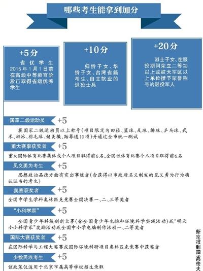 近日,北京市教委正式公布了2015年高考加分实施方案,将于5月8日起实行。方案显示,今年北京高考仅有两类考生可以享受20分加分,分别是烈士子女,以及在服役期间荣立二等功以上,或被大军区以上单位授予荣誉称号的退役军人。