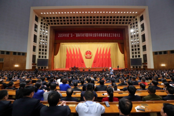 4月28日,“五一”国际劳动节即将来临之际,2015年庆祝“五一”国际劳动节暨表彰全国劳动模范和先进工作者大会在北京人民大会堂隆重举行。新华社记者鞠鹏摄