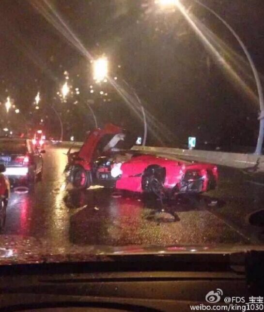图说:红色法拉利跑车发生单车事故。