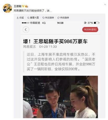 原标题:王思聪否认买超跑 称网易屡教不改