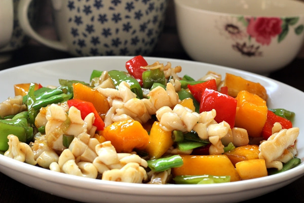 创新水果海鲜菜 五彩芒果炒鲜鱿