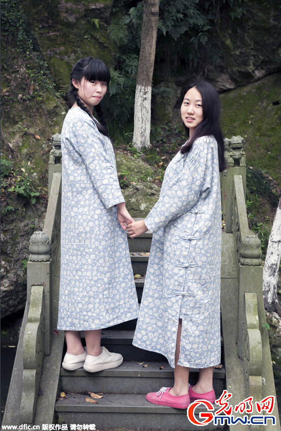 4月28日,浙江台州,温岭市新河中学的高三学生,穿着改版旗袍,拍摄毕业照。这种旗袍一改传统旗袍修身束体的式样,配上蓝色碎花仿佛床单裹在身上。