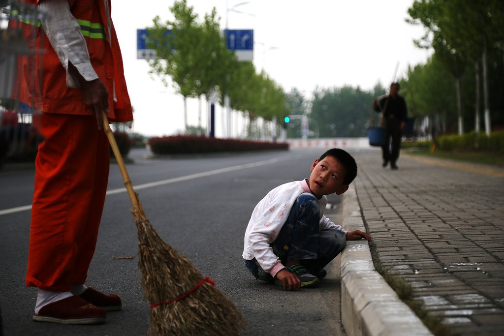4月27日14时许,记者看到,在磨店老街门口的文忠路上,老人负责大约1公里长的马路清扫工作,就在他顶着烈日清扫路面积叶时,12岁的宁海军就坐在路牙上,呆呆地看着,时不时跑过来玩闹。