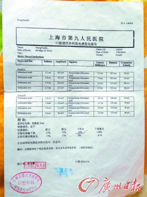 2014年10月10日,上海第九人民医院神经内科为张雨做了“神经电生理检查”,报告单显示:“左侧面神经传导运动波幅较对侧下降,左侧上唇提肌肌电图可见多相电位增多。提示左侧面神经部分损伤。”2014年10月~12月间,张雨先后11次到上海市中医医院就诊,就医记录显示诊断为“左侧面神经受损”。
