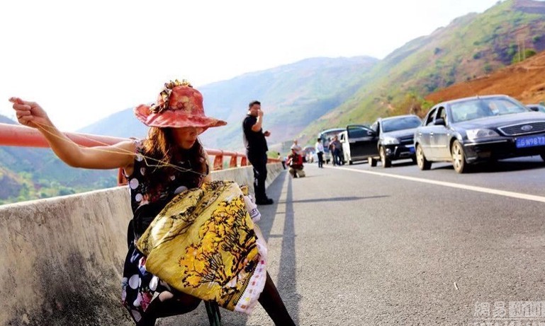 图为G80广昆高速上,一位女士悠哉悠哉地搬个马扎坐在路边刺起了十字绣。