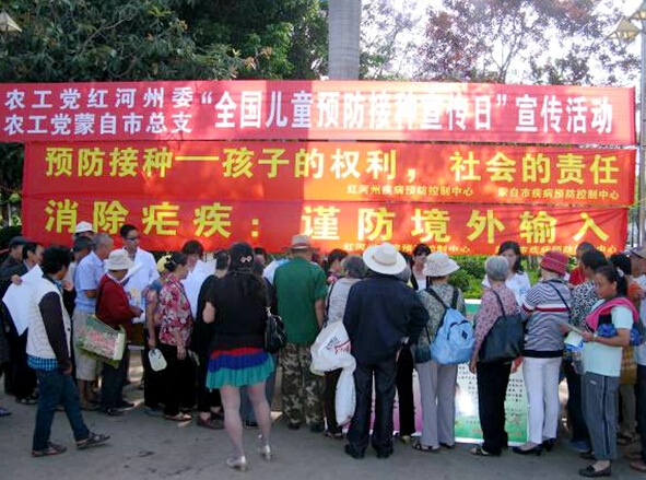 2015年4月21日上午,农工党红河州委会、蒙自市总支,与红河州疾控中心、蒙自市疾控中心联合在蒙自市南湖广场开展第26个全国计划免疫宣传日公益宣传社会服务活动。农工党红河州委会副主委孙学君参加活动。